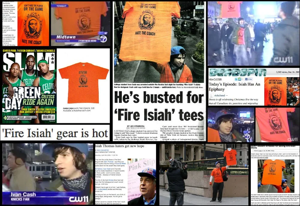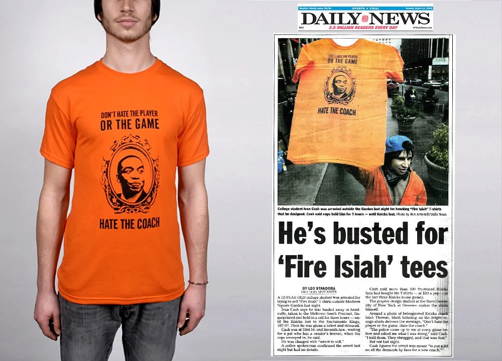 In response to a series of bad decisions made by former NY Knicks coach Isiah Thomas in 2007, I hand-printed t-shirts allowing fans to express their disapproval. After selling 250 shirts outside of Madison Square Garden over the course of three games, I was unexpectedly arrested (link).